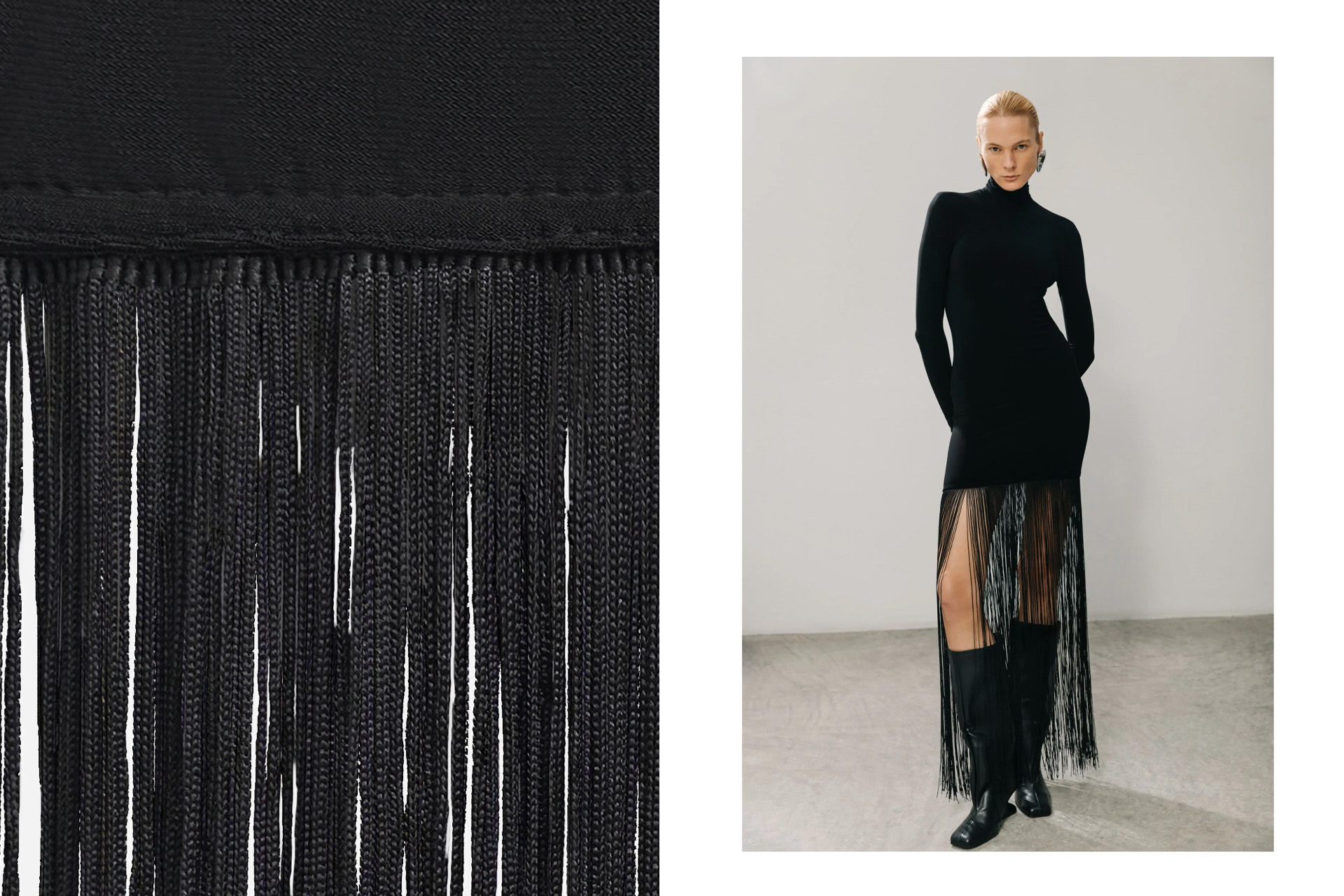 В этом платье мы тоже используем наш любимый приём превращения простого в концептуальное. Верх платья сделан как водолазка — из мягкой двухслойной эластичной ткани, которая облегает фигуру как вторая кожа и не просвечивает. А длинная бахрома меняет всё, добавляет ритма, энергии, превращает лаконичное изделие в по-настоящему эффектный айтем.