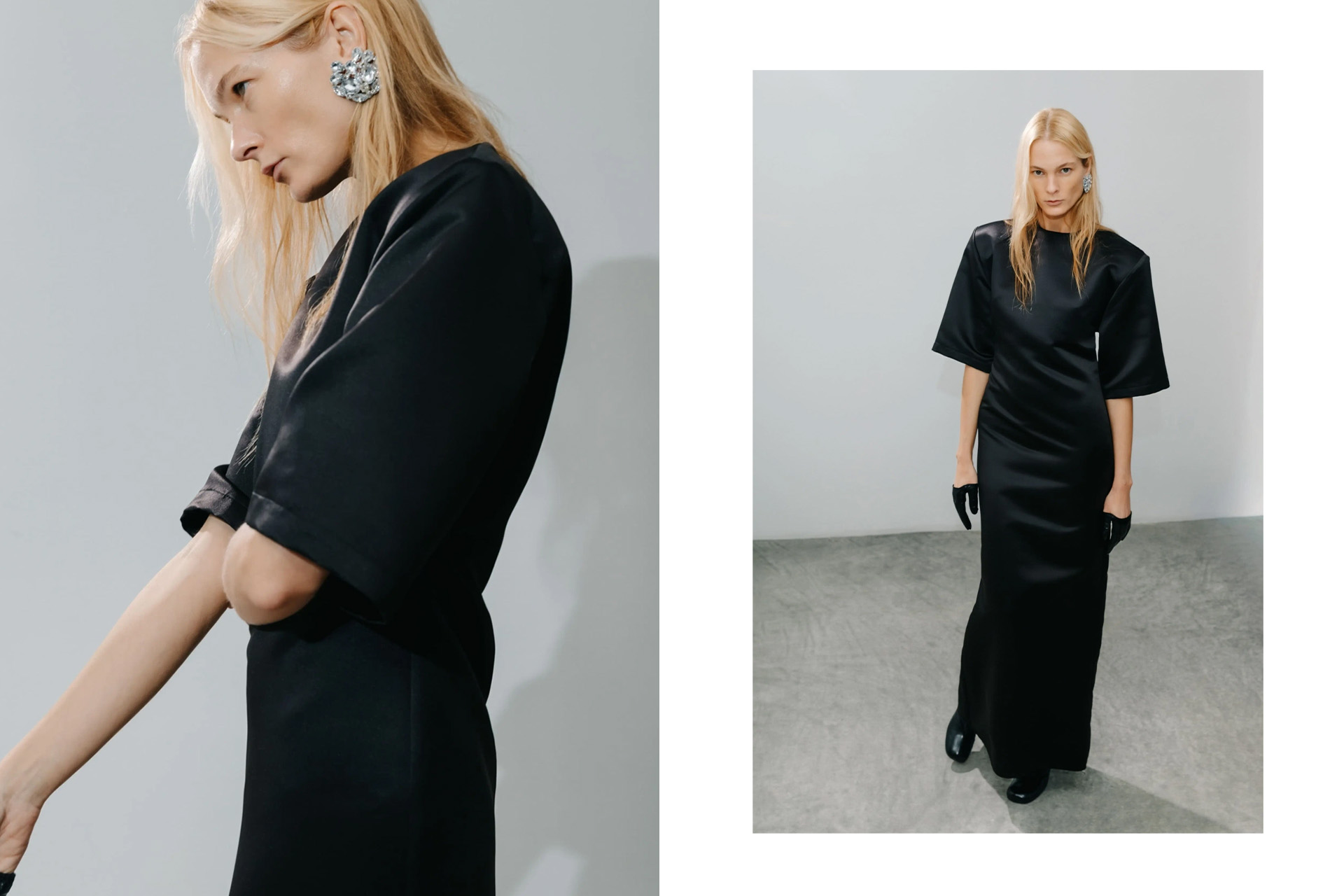 Это — архитектурное сердце коллекции. Летом мы выпустили платье-футболку из мягкого хлопка, и оно стало бестселлером — очень многие наши клиентки надевали именно его на выход, на вечеринки. В новогодней коллекции мы повторили этот силуэт, но уже в более нарядном исполнении. Сшили его из дюшеса — это плотная ткань с сатиновым блеском, она хорошо держит форму и подчёркивает архитектурность кроя.