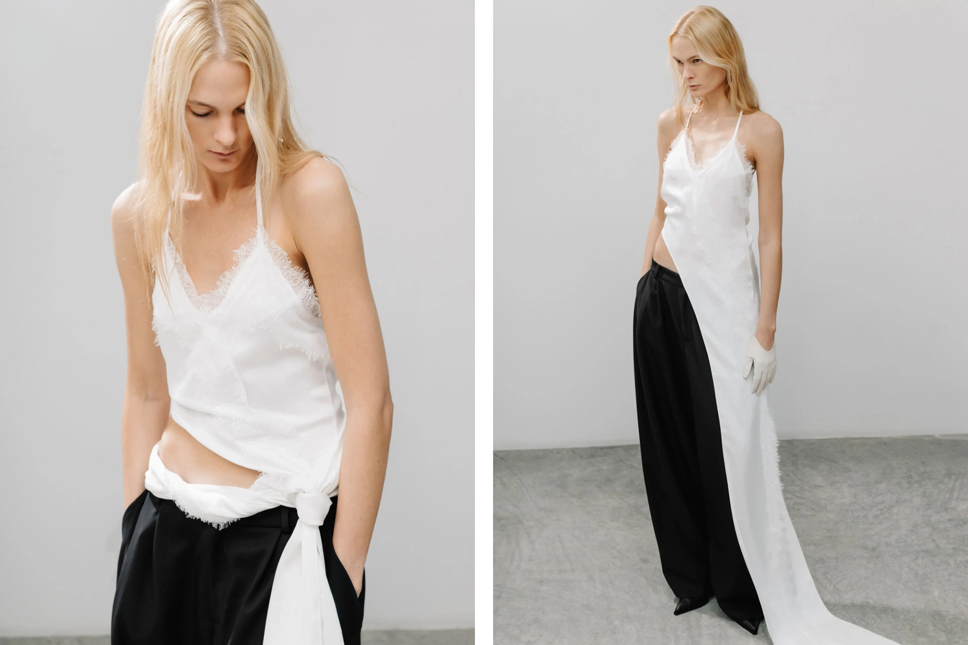 Единственный светлый акцент в чёрной капсуле — топ из жатого атласа с нежным кружевом. Мне очень нравится тренд на бельевые топы, но мы «докрутили» идею в своём стиле, сделав один край топа максимально длинным. Получился топ-трансформер, который можно носить разными способами: длинный асимметричный край превращается то в шлейф, то в шарф, то в мягкую драпировку на плечах.