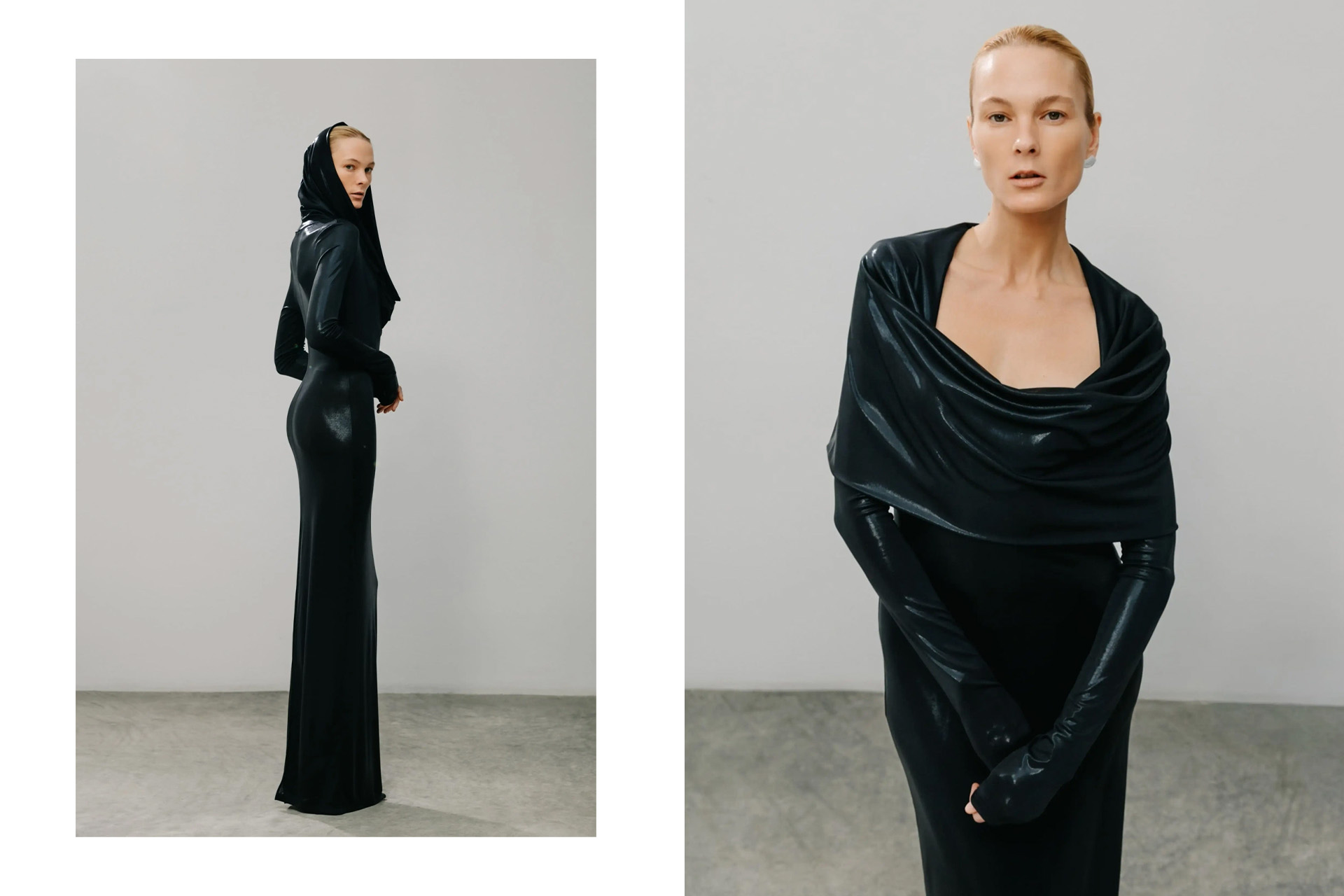 Платье готической русалки. С одной стороны, из-за длины и капюшона оно закрытое, строгое, с другой — очень чувственное благодаря струящейся тонкой ткани с блеском и глубокому декольте. Мне нравится, что сзади у платья высокий разрез — он добавляет дерзости и драмы. К тому же это удобно, так как вы можете ходить своим обычным шагом — платье не стесняет движения.