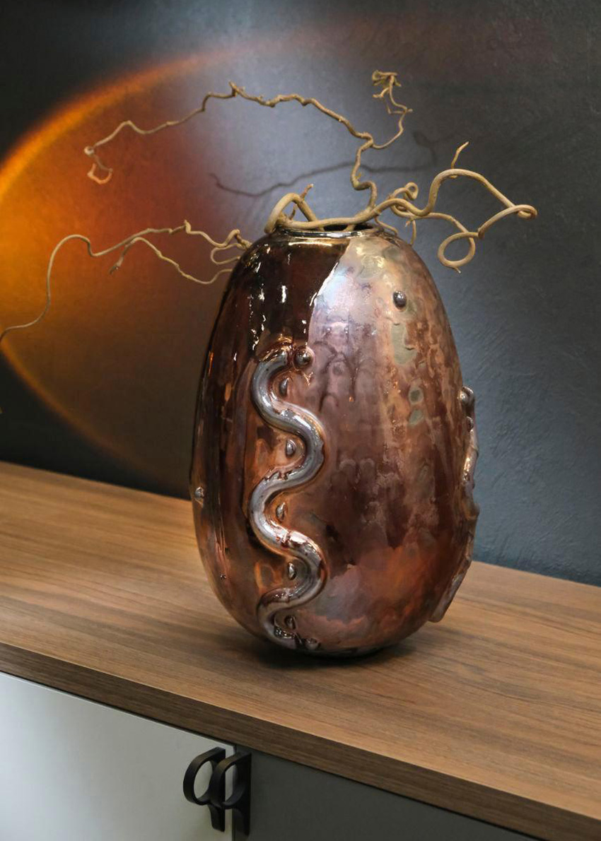 Особое место занимает обжиг в технике раку — японский способ, при котором огонь взаимодействует с глазурью в живом, непредсказуемом процессе. Поверхности получаются насыщенными, подвижными, с индивидуальной кожей.