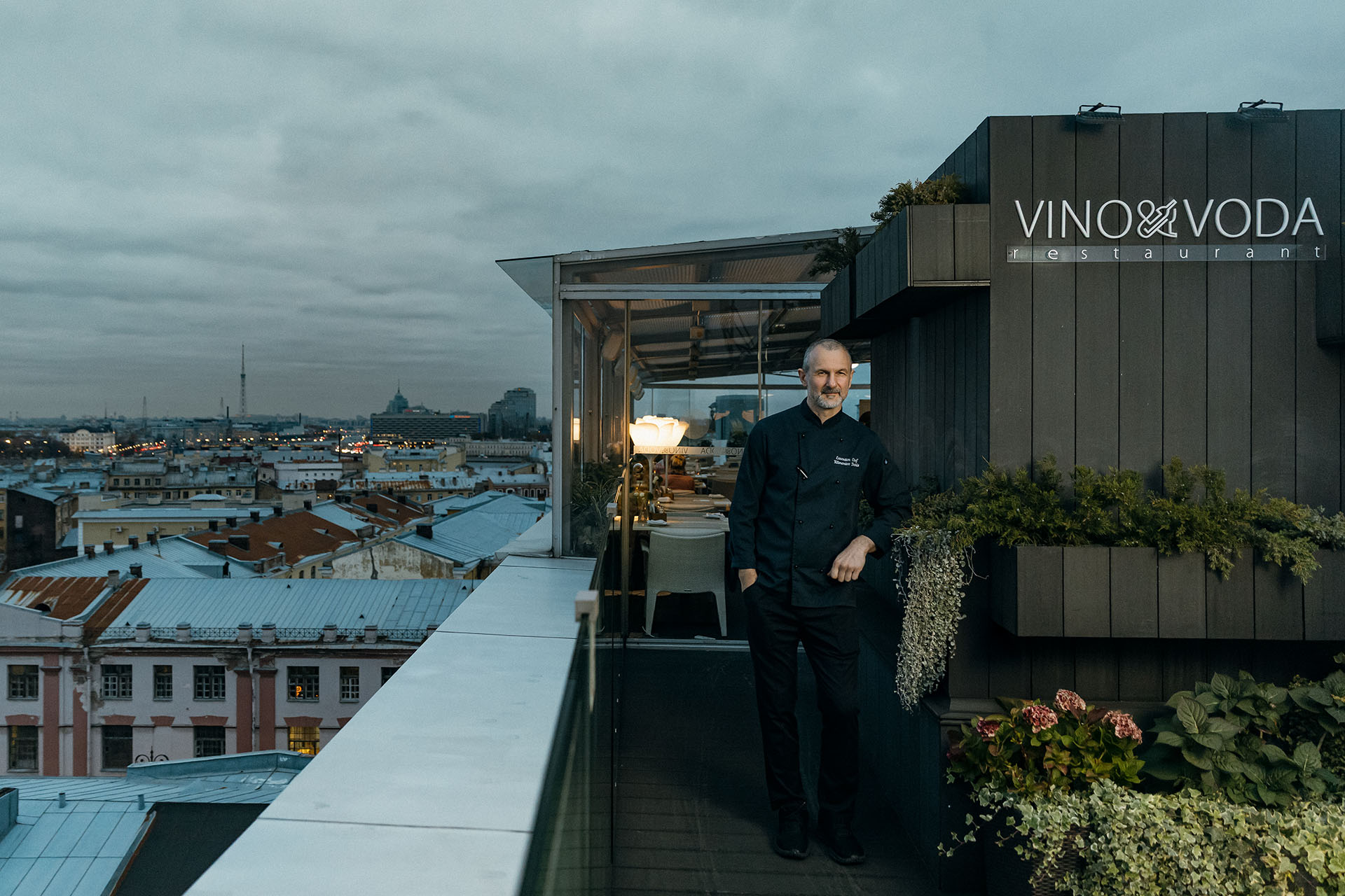 При отеле открыты «Афиша бар» и основной ресторан «Вино и Вода». «Афиша бар» — комфортное место, где удобно встретиться, пообщаться, выпить кофе, быстро пообедать или поужинать. «Вино и Вода» — ресторан авторской кухни. Во время низкого сезона он занимает пространство просторного атриума, сквозь его стеклянную крышу видно небо. А по утрам здесь всегда подают завтраки. У нас есть и малый атриум, где проходят различные мероприятия. Обе локации напоминают дворы-колодцы Питера (кстати, я родился на Васильевском острове, моё детство прошло в подобном дворе). С апреля по октябрь ресторан переезжает на террасу на крыше отеля. Наши гости особенно любят её за открывающийся вид на город — отсюда весь Петербург как на ладони. На террасе, а также на других площадках отеля часто проходят свадьбы, дни рождения, корпоративные мероприятия. Форматы разные: банкеты, фуршеты, деловые завтраки. А ещё мы проводим винные ужины с различными винными компаниями.