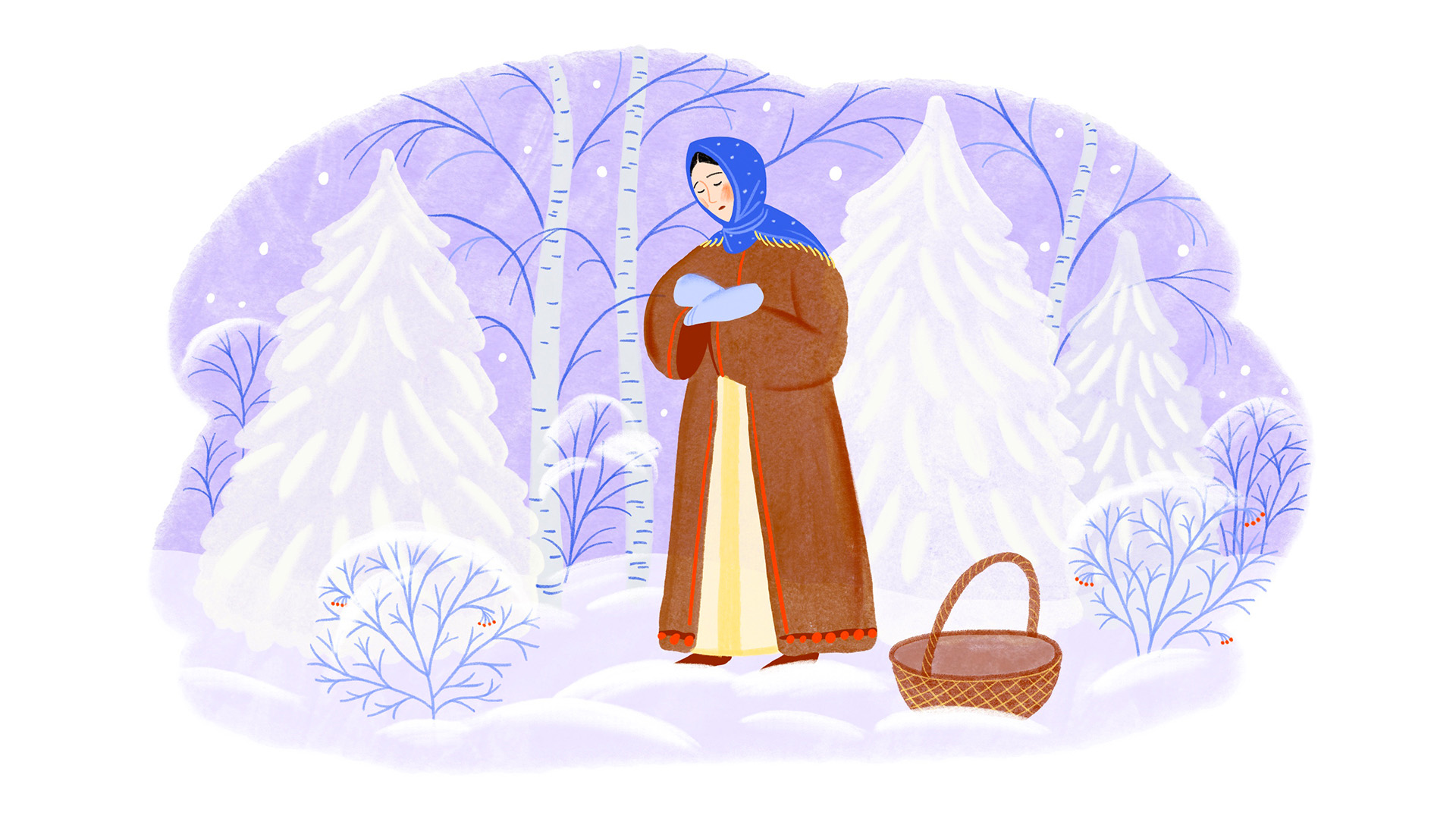 Девочка-сирота из сказки «Двенадцать месяцев» — образец доброты, кротости и смирения, но живётся ей непросто. Её нещадно эксплуатирует злобная мачеха: под Новый год она посылает падчерицу в лес за подснежниками, чтобы потом обменять их у королевы на золото. Возвращаться без цветов девочке строго-настрого запрещено.