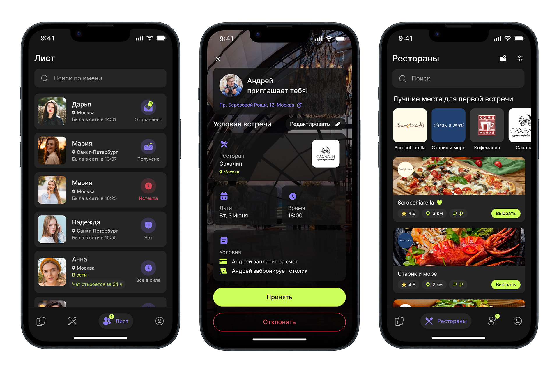 У нас нет лайков, мэтчей, переписок. Вы регистрируетесь, выбираете человека, который вам симпатичен, и отправляете ему приглашение в ресторан, кафе или бар. Получатель может согласиться или отказаться (или поменять время и место) встретиться с вами.