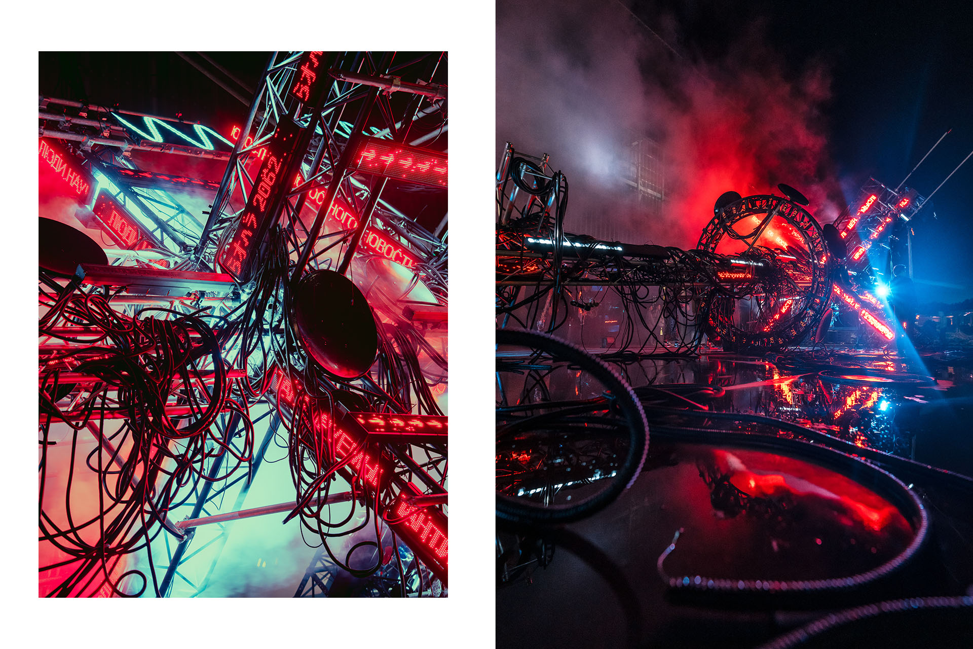 Кира Борисова, группа Panterra: «Идея “Дзена” у меня вынашивалась почти два года. Мне давно хотелось сделать что-то очень горизонтальное, чтобы конструктив был максимально близко к людям. Объект — это лежащая башня, такая спутниковая штука, которая как будто пронзает Землю насквозь: от Бразилии до России. Она не упавшая, а именно протыкающая, и из-за этого возникает ощущение, что ты добрался до её вершины. Для меня важно не столько скульптурное состояние, сколько гипнотическое. Свет, дым и звук здесь — не украшение, а способ воздействия. При этом вся конструкция собрана из обычных прокатных сценических ферм: из самых простых вещей мы каждый раз собираем цельный, сильный образ. “Дзен” лежит в пространстве и ловит волны — как радиостанция, цепляющая сигналы, музыку и обрывки времени».
