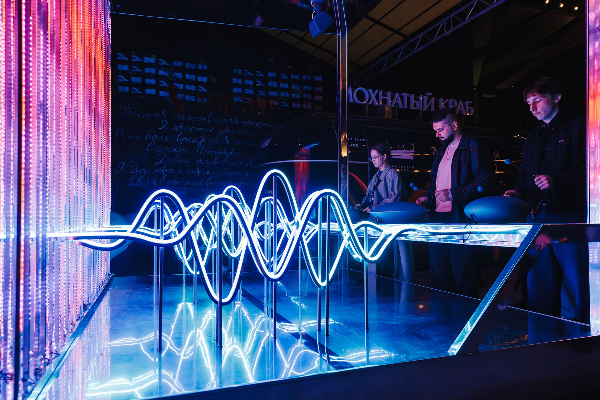 ISKRA — молодая арт-группа выпускников Британской высшей школы дизайна, дебютировавшая с этим проектом на фестивалях Portal и Digital Rain. «Resonance» — аудиореактивная инсталляция, построенная на физическом принципе резонанса. Зритель взаимодействует с объектом через звук: каждый импульс вызывает световой отклик, усиливая эмоциональное состояние участника. Работа создана совместно с учёными наукограда Черноголовка и показывает, как научный эксперимент может превращаться в понятный и чувственный художественный опыт.