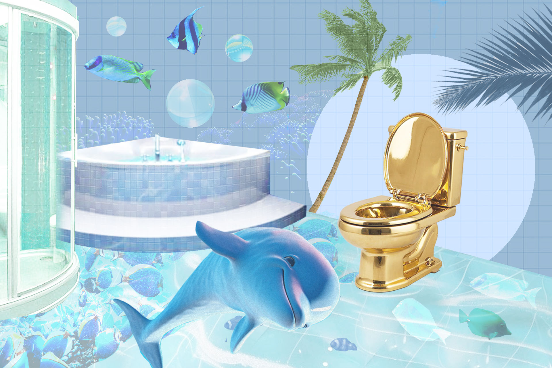 Буквально — золотой унитаз (смеётся). Просто алтарь интерьерного дизайна — не нулевых, правда, скорее 1990-х. Вокруг него — обязательно какая-то плитка с золотинкой. А ещё удивительно, как часто в этих ванных встречался такой элемент — может, у вас он сейчас тоже «всплывёт» в памяти — это большие рыбы на полу. Как будто стоишь на стекле, а у тебя под ногами открылся изобильный подводный мир.