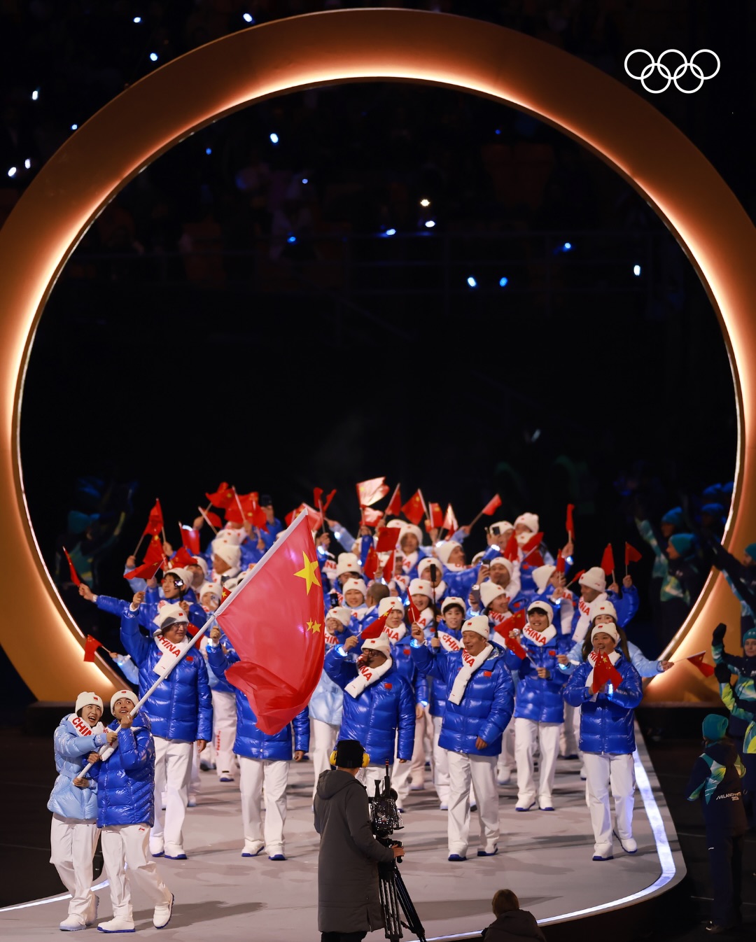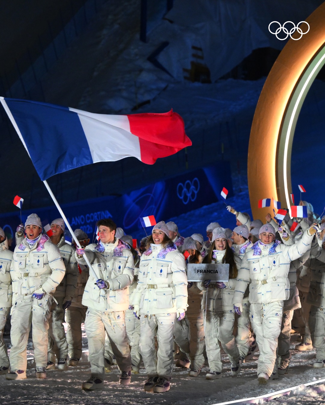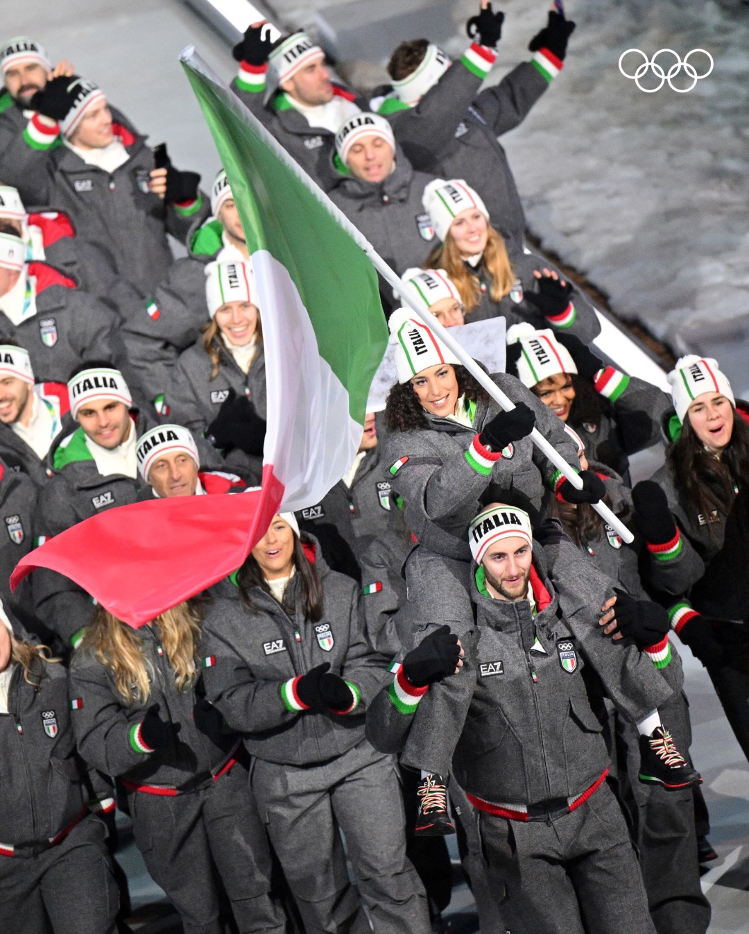 Парад спортсменов также прошёл в новом формате. Делегации выходили одновременно в четырёх городах, при этом каждая сборная могла задействовать двух знаменосцев — по одному на разных площадках. Такой подход позволил включить в церемонию команды, задействованные на удалённых горных объектах. Сборная Италии завершила парад.