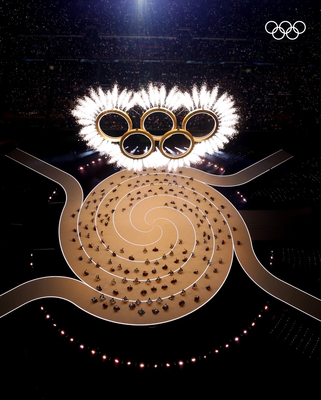 Финалом церемонии стало одновременное зажжение двух чаш олимпийского огня. В Милане огонь зажгли у Арки мира, в Кортина-д’Ампеццо — на площади Анджело Дибона. В Милане факел несли Альберто Томба и Дебора Компаньони, в Кортина-д’Ампеццо чашу зажгла София Годжия. По замыслу организаторов, этот формат символизирует связь двух ключевых центров Игр.