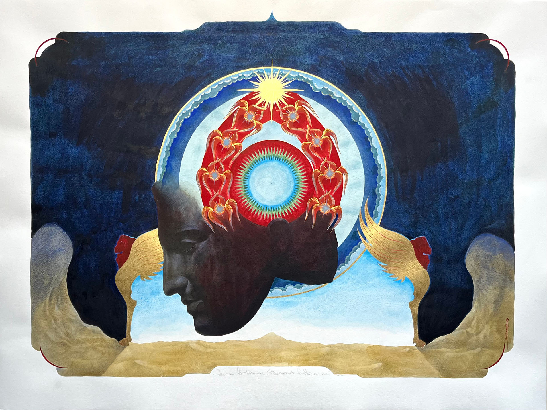 Сергей Копылов родился на Востоке, в Ташкенте, и жизнь на стыке культур, традиций и религий определила один из ключевых векторов его творчества. В этой работе, кажется, сходятся мировые религии: вокруг головы человека возникает Мандала Преображения — симметричный буддийский и индуистский символ мира и вселенной, соединённый с христианскими образами — херувимами и львами. Здесь же зашифрован наклон Троицы деисусного ряда иконостаса, символ молитвенного предстояния изображённой фигуры.