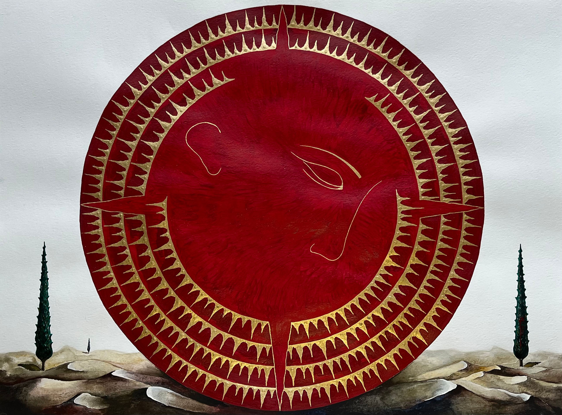 При этом зрительский маршрут можно выстроить и иначе. Начать с масштабного «Сретения», постепенно углубляясь в пространство, чтобы в финальной точке взгляд «сузился» до точки на красном солнце. Профиль, изображённый на нём, — мультикультурный. Это точка сборки, из которой всё произрастает и к которой всё возвращается.