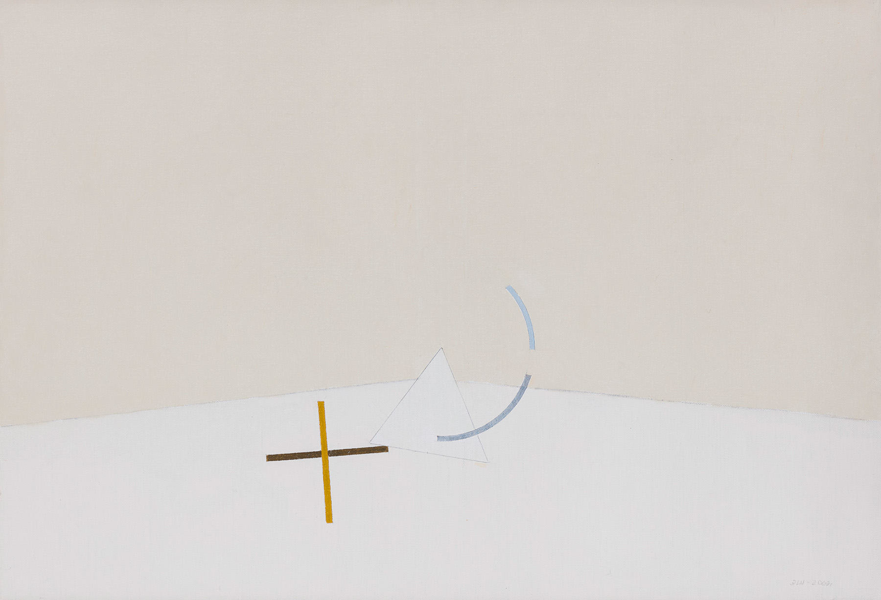 «Композиция» — хрестоматийный пример позднего периода. Здесь окончательно исчезает любая связь с предметным миром. Сдержанный, тонко настроенный колорит и строгая геометрия кочуют из холста в холст, лишь едва меняя очертания.