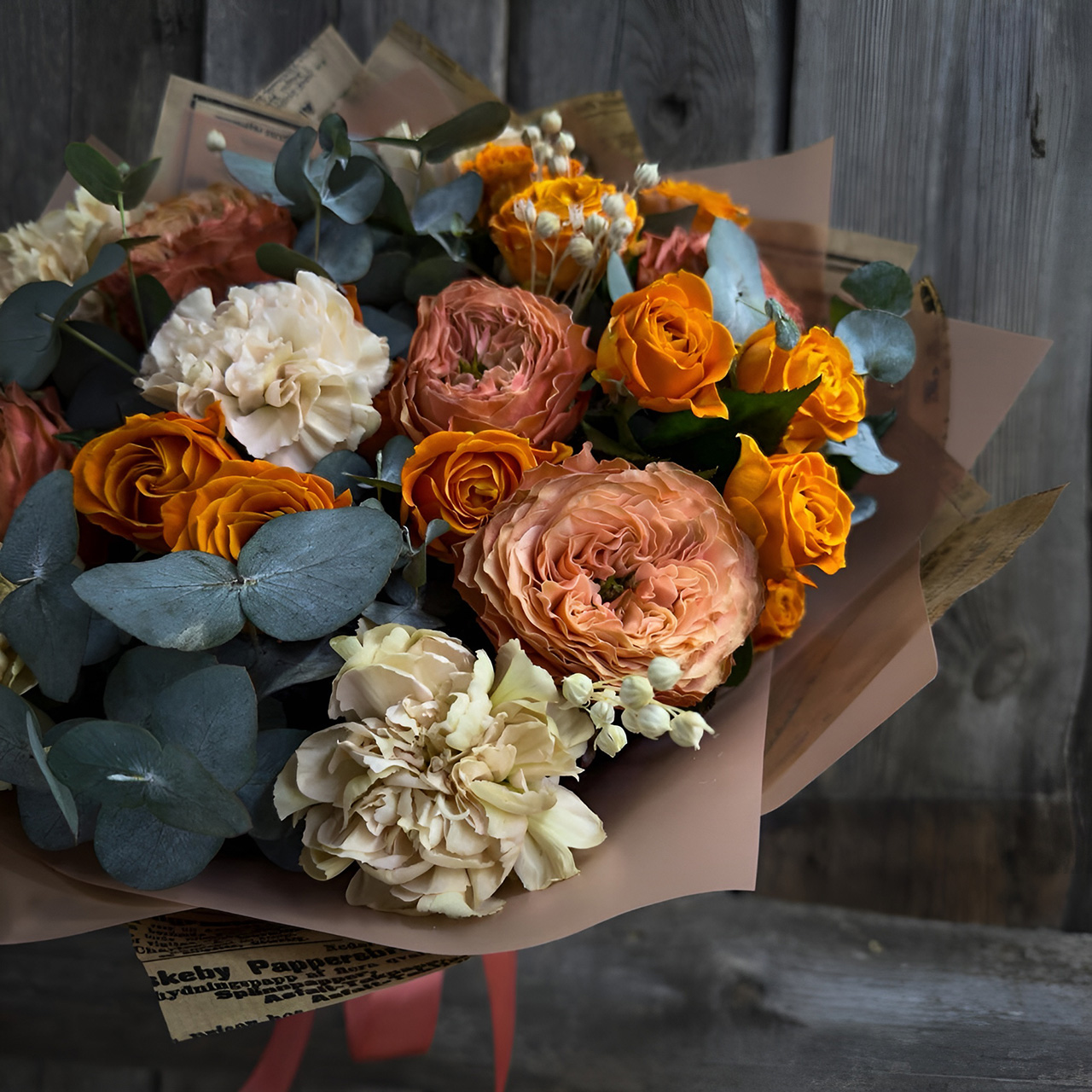 Для мамы или бабушки подойдут букеты в насыщенных оттенках: терракотовом, оранжевом, пыльно-розовом, персиковом. «В такой гамме красиво смотрятся кустовые и пионовидные розы. В композицию можно включить розовые гвоздики, которые традиционно считаются символом материнской любви, а также хризантемы — символ счастья и долголетия», — говорят во Flowwow.