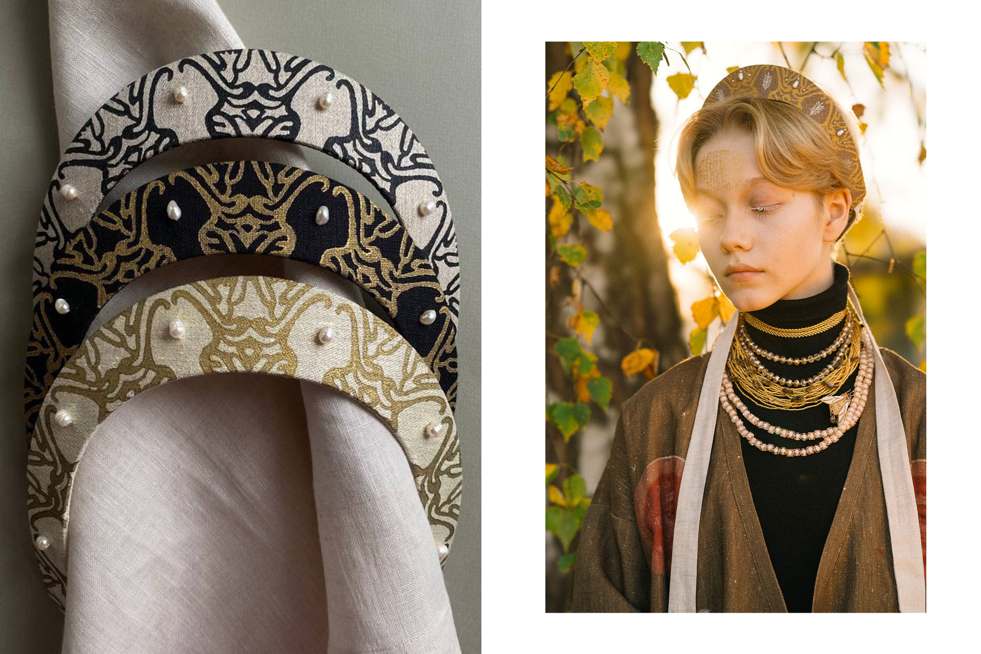 Впервые на фестивале. Льняные аксессуары, вдохновлённые традициями, — в современной интерпретации. Бренд стилизует головные уборы: венцы, лунники и головодцы — и показывает, что традиционные аксессуары актуальны и сегодня.