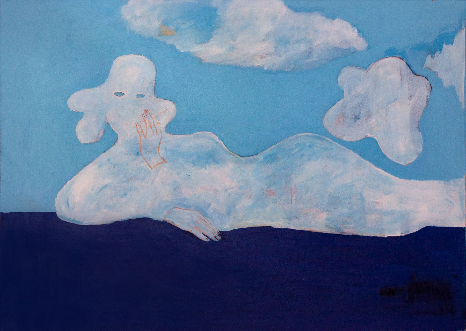 Ссылка на изображение Работа Адель Левитовой «Женщина-облако» относится к серии «Люди-облака», созданной во время пребывания художницы в Израиле. Одним из главных впечатлений для нее стало местное небо — ясное, насыщенно-голубое, с медленно плывущими облаками. Их мягкие, расплывающиеся формы стали для художницы визуальной метафорой творческого процесса.