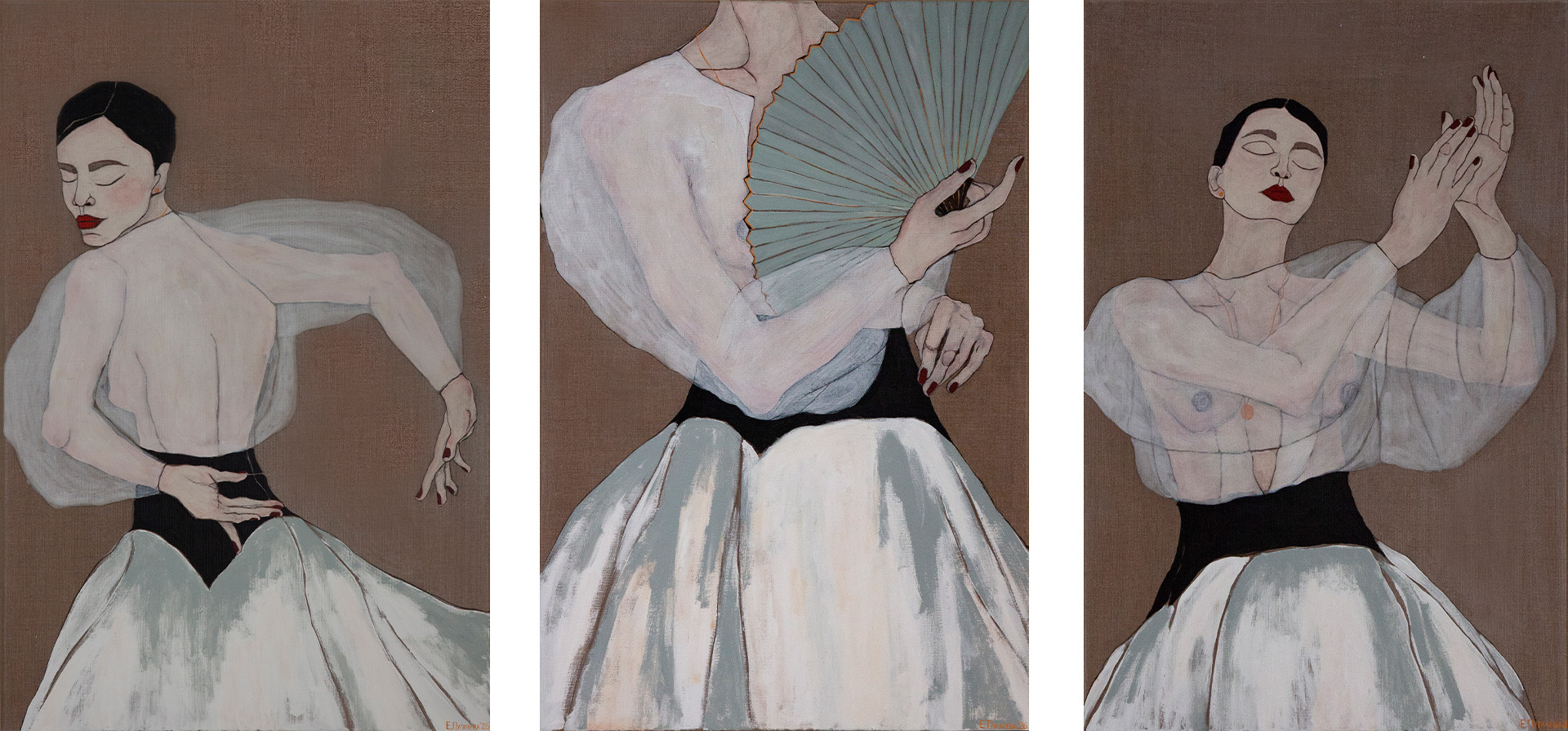 Танцовщицы в работах — не столько персонажи, сколько состояния и стихии, а их танец — отклик на «переменную облачность» времени. Это энергия, которая меняет пространство: вторгается в его слои, создаёт вихри, запускает движение воздуха. Женщина же, по мысли Екатерины, призвана хранить тепло и одновременно приносить смену сезонов и ритмов — не давая остыть чувствам и возвращая миру дыхание свободы.