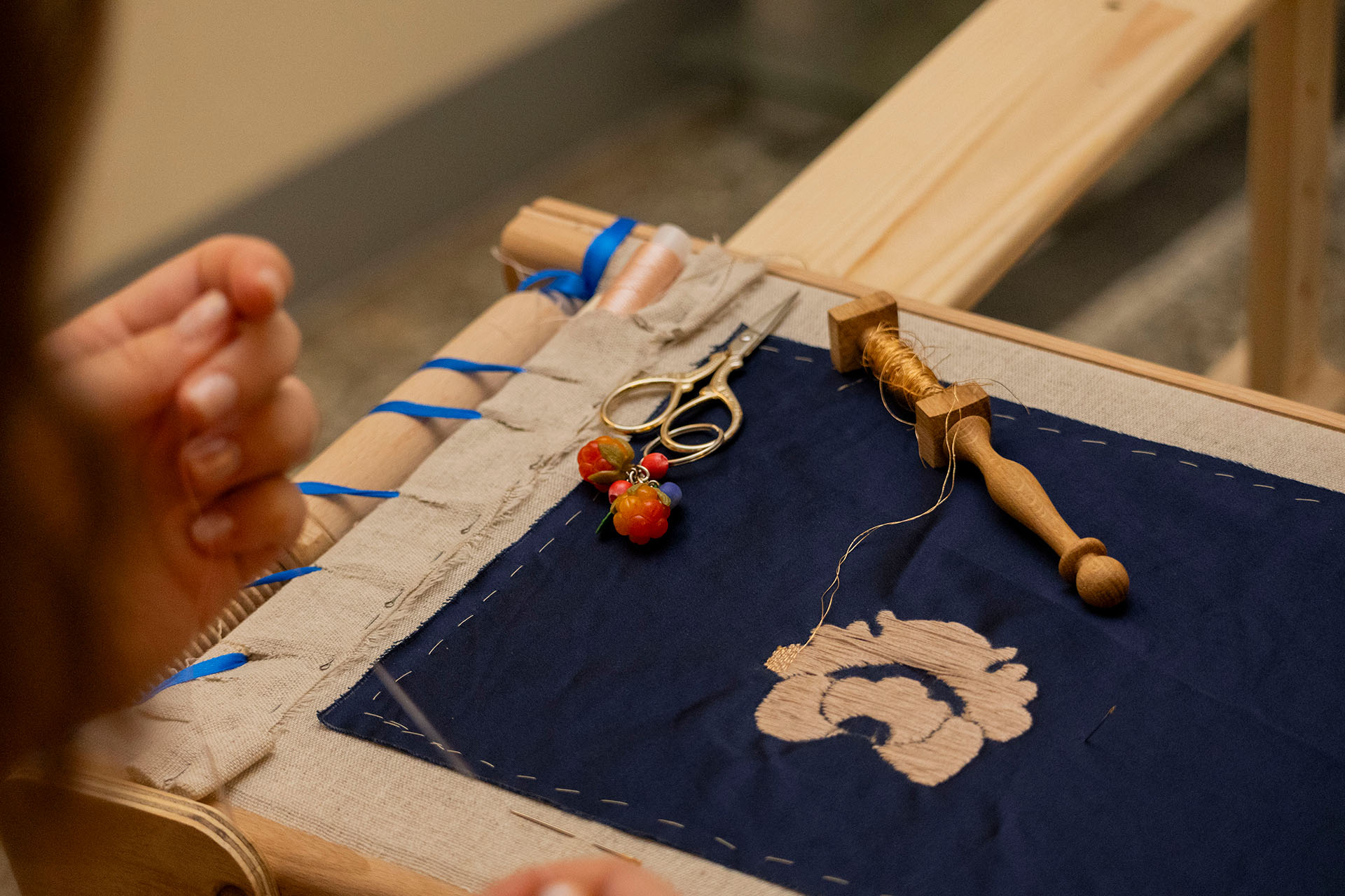 Главный элемент, конечно, сама нить. Марина Галицкая, главный специалист по культурно-образовательным проектам РЭМ и художник декоративно-прикладного искусства, рассказывает: «Важно не путать золотную нить с металлизированной. У них разная структура. Золотная — это хлопковая или шёлковая основа, оплетённая тончайшей золотой проволокой. Сегодня в России только одно производство делает нити по старым стандартам — Денисовский завод в Московской области. Чаще материал просто золотят».