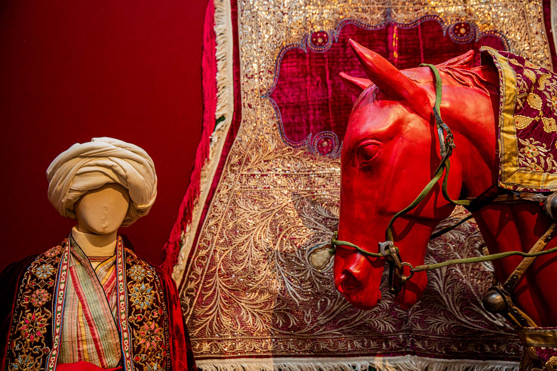 Бухарские ханы выезжали на лошадях именно в таком виде. Седельный комплекс расшивали золотными и серебряными нитями, украшали золочёными вставками, бахромой и кистями. Такое богатое убранство подчёркивало царственный статус эмира и выделяло его среди свиты.