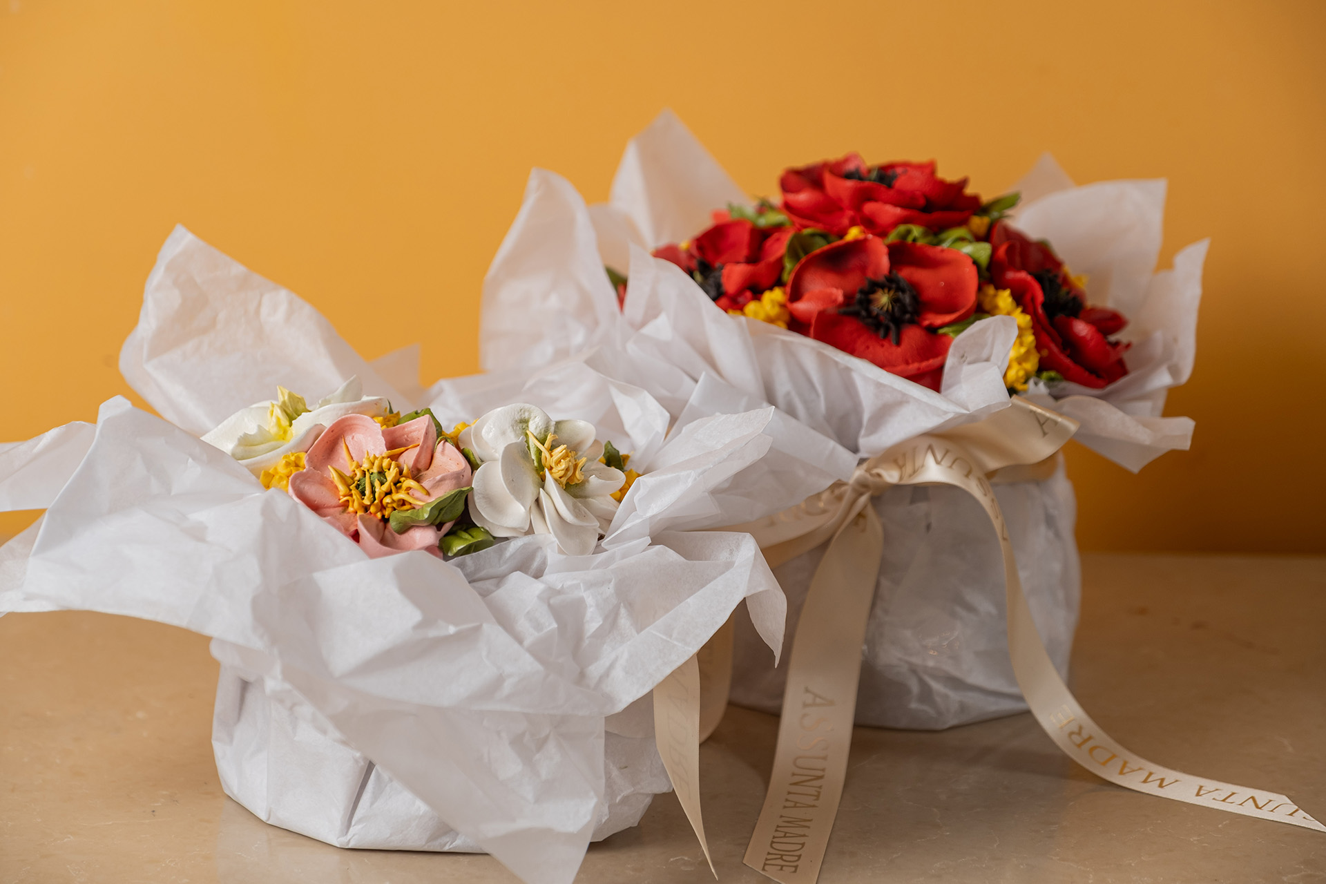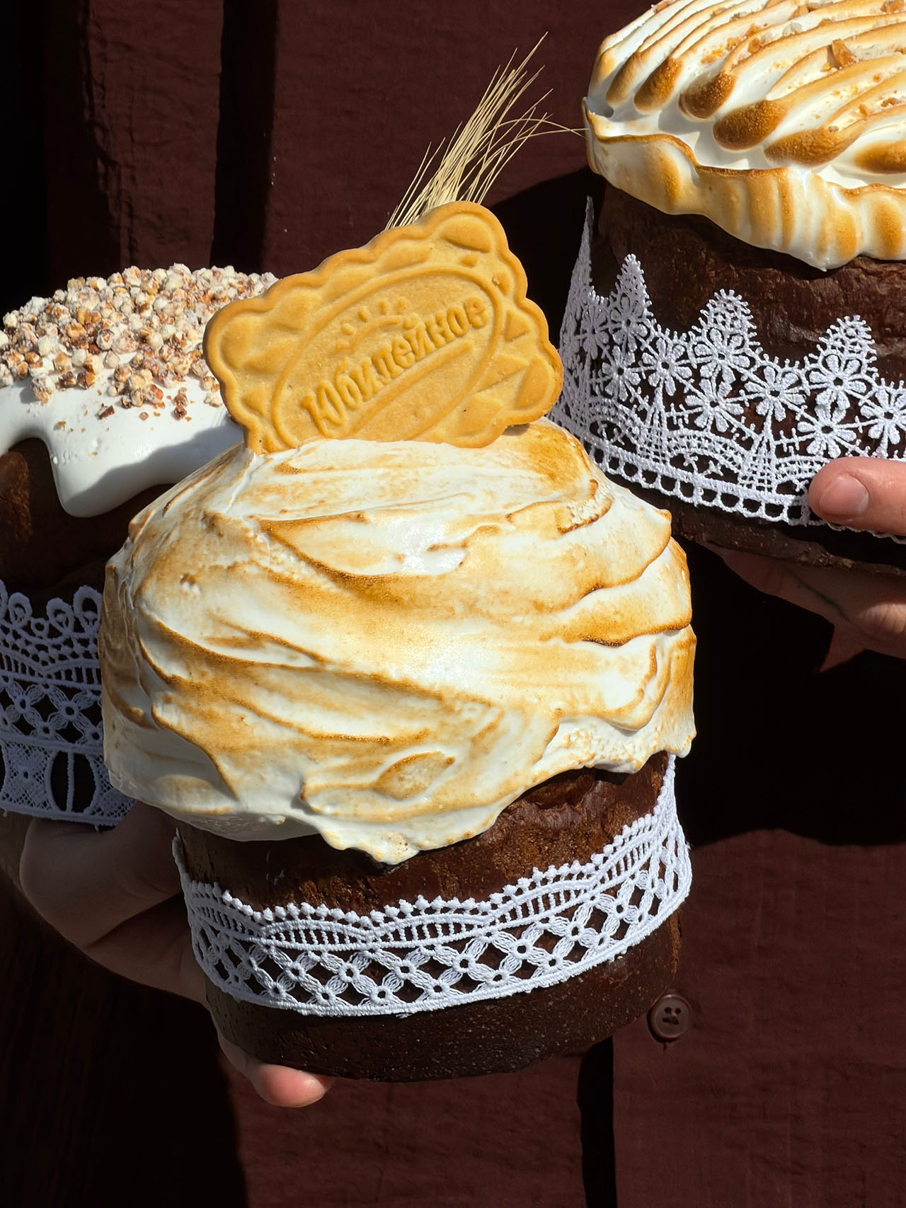 В основе местных куличей классическое сдобное тесто с пропиткой из рома и ванили, дополненное итальянскими орехами и цукатами. Ставка сделана на визуальное оформление: каждый кулич покрывают тонким слоем сахарной помадки и украшают зефирными маками, которые команда собирает вручную. Есть два варианта размеров: большой и средний.