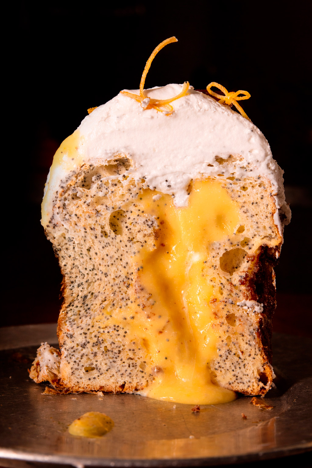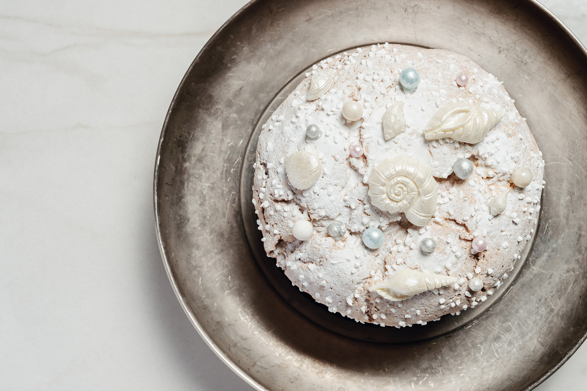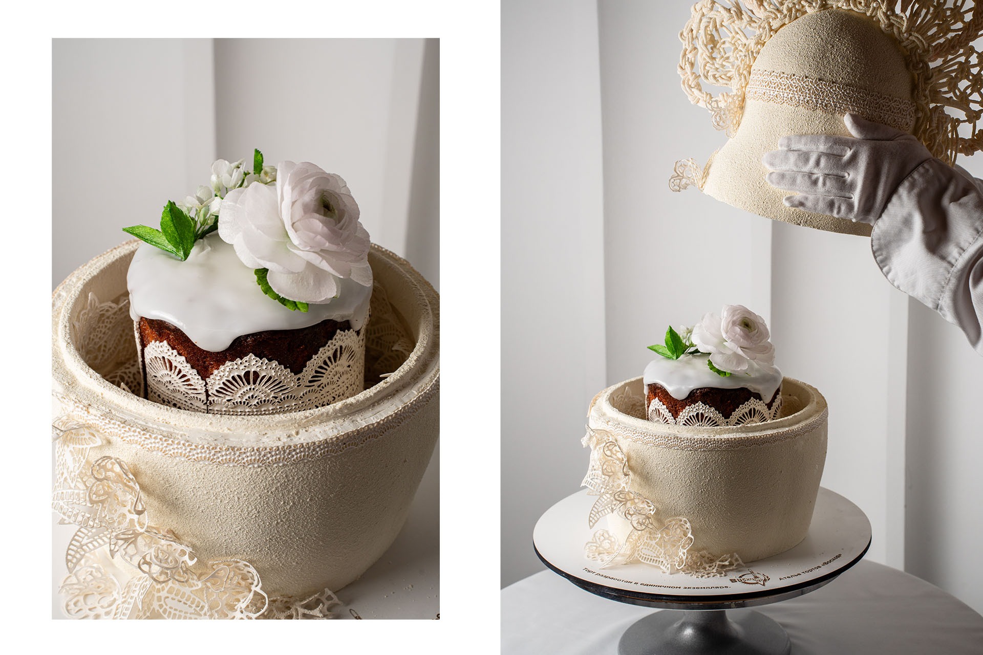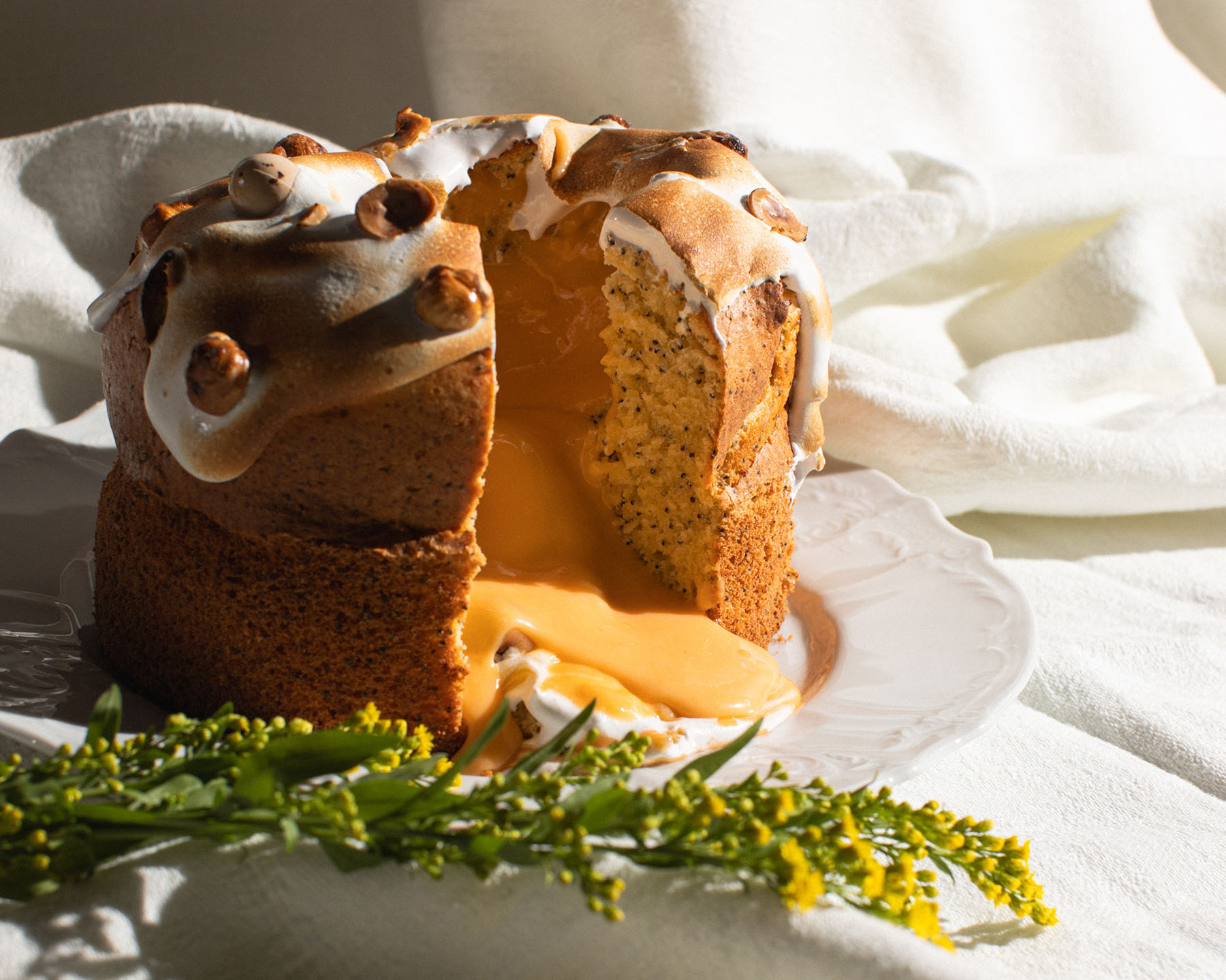 Ресторатор и владелица проекта Лариса Мемедова предложила свою рецептуру — это творожный кулич с маком и лимонным курдом. На шапке из обожжённой итальянской меренги элегантный декор — фундук, шоколадно-марципановые яйца, цветы и листья шалфея.