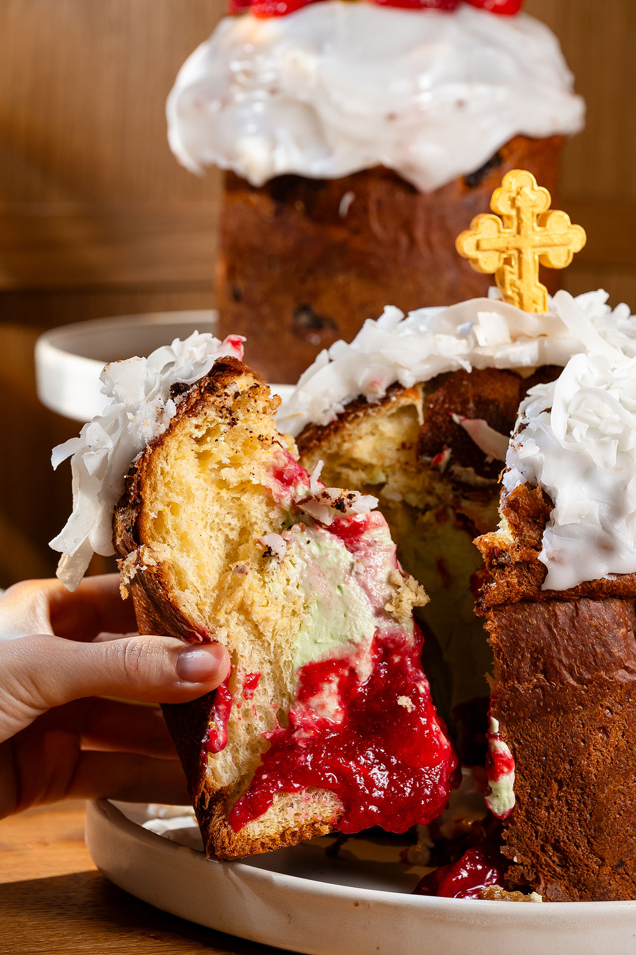 В ресторане есть сразу несколько вариантов праздничного угощения: от «Царского» кулича с шафраном, белой черешней и цитрусами до безглютеновой версии с фисташкой и малиной и даже праздничной матрёшки в полметра ростом с «Царским» куличом внутри от шеф-кондитера Ольги Рыбаковой. Каждую «Матрёшку» Ольга собирает лично, на изготовление от замеса теста до финальной росписи макраме из съедобных нитей и узоров из айсинга уходит несколько дней. Кулич «Матрёшка» доступен только по предварительному заказу. Срок изготовления — 6 дней.