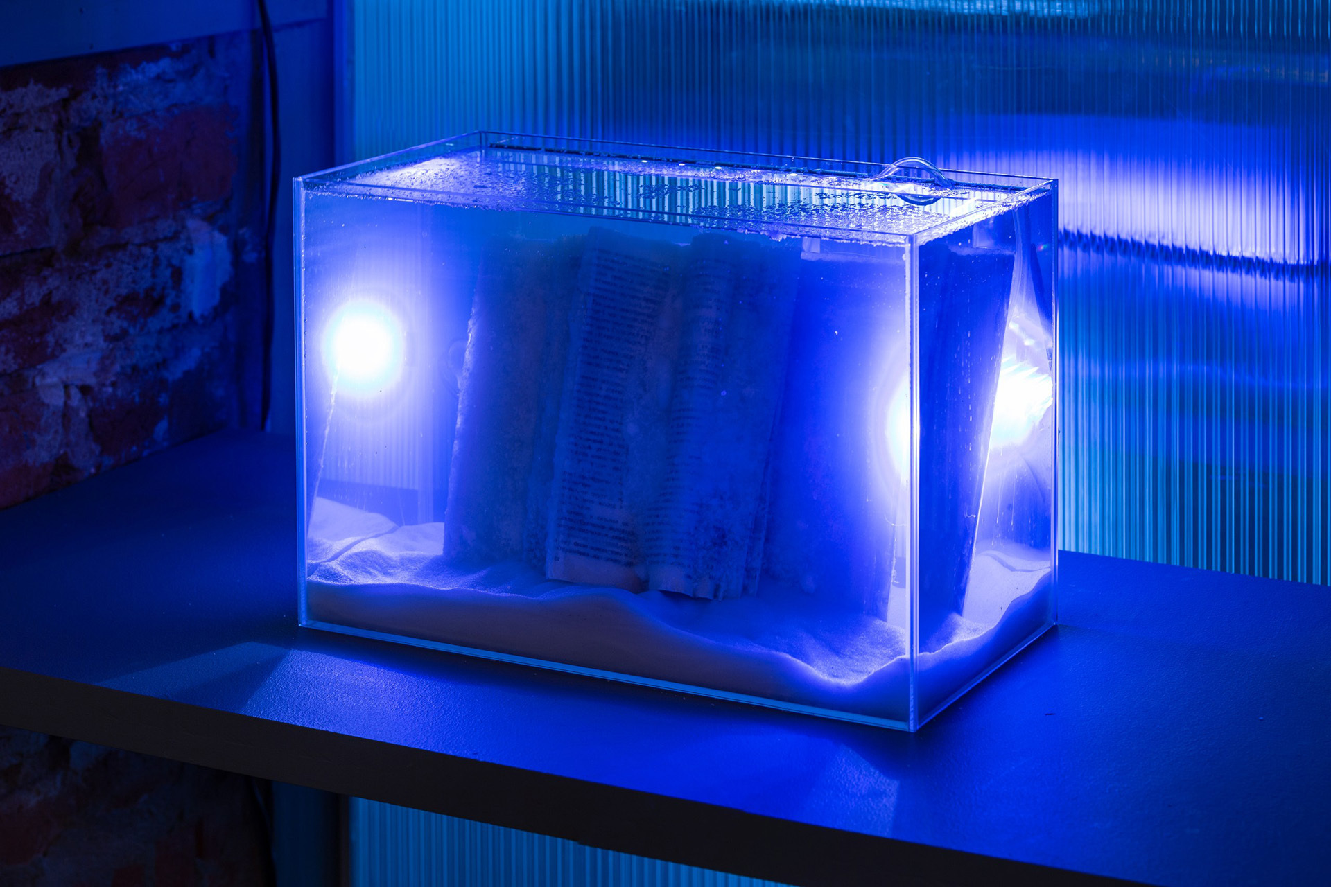 Загадочная работа «Подводная библиотека» представляет собой аквариум, в котором погружена в воду залитая парафином книга Сельмы Лагерлёф. Само название отсылает к Атлантиде, к библиотекам затонувших цивилизаций, знание которых не исчезло, а осталось на дне, видимое, но недосягаемое, существующее в среде, где его нельзя прочесть привычным образом. Среди книг такой подводной библиотеки оказывается именно Лагерлёф.