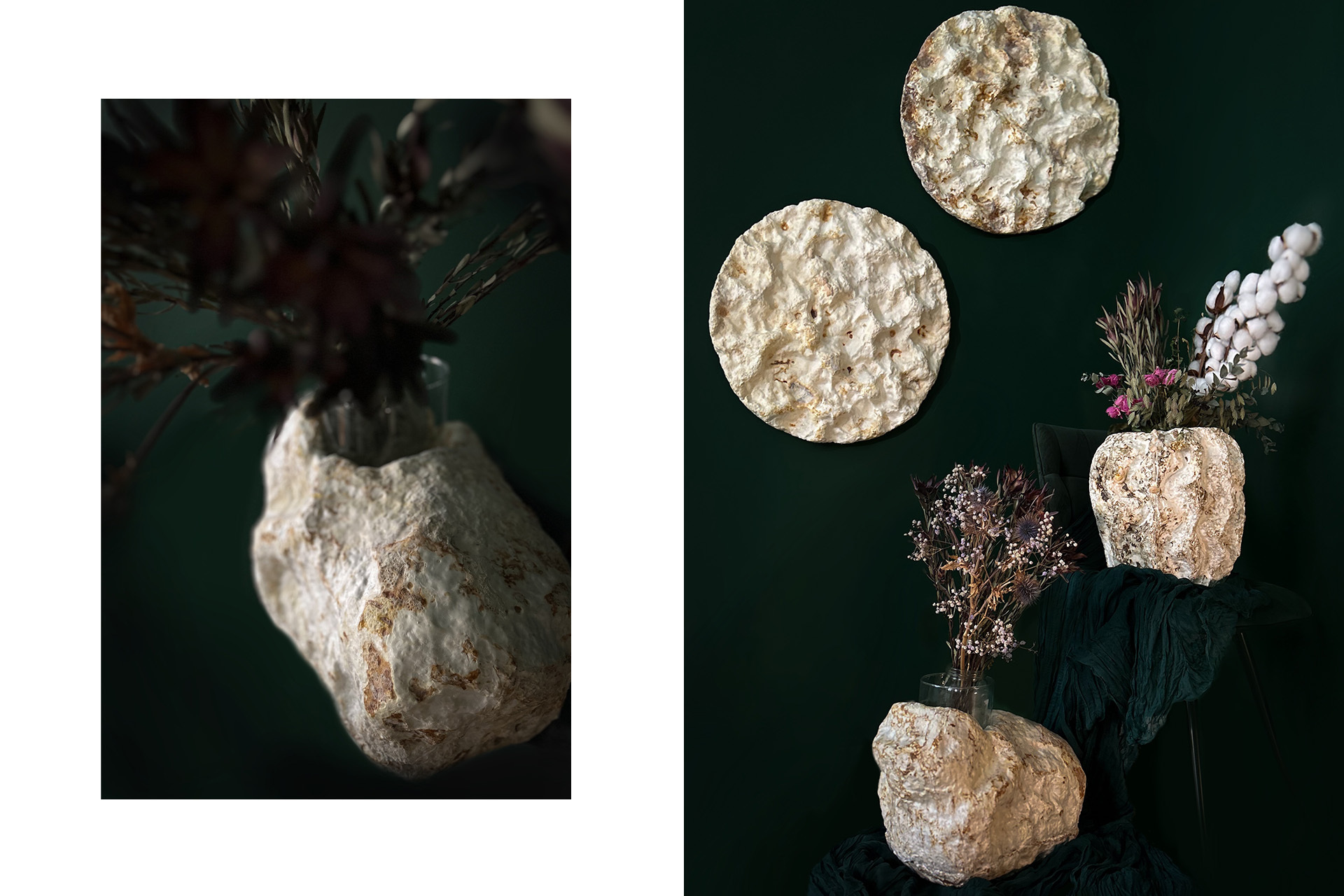 Есть у нас и 2% брака. Как и на любой мануфактуре, наши специалисты с присутствием дизайнера проводят проверку каждого изделия. Если мы видим, что фактура не эстетична и вызывает вопросы — например, зазор у вазы выглядит неаккуратно, или край панно деформировался во время роста, — мы отправляем изделия на переработку. В нашей компании запрещено выбрасывать отбракованные изделия. Все возвращается в производственный цикл.
